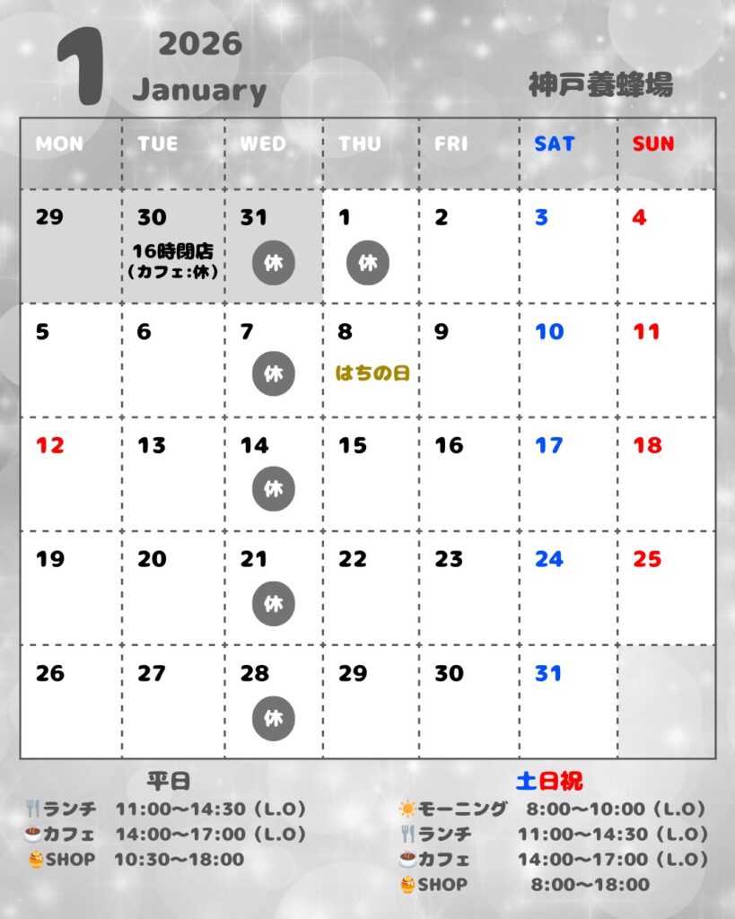 新着情報NEWS 2025.12.31新着1月の営業日のお知らせ いつも神戸養蜂場をご利用いただき、誠にありがとうございます。1月の営業日および営業時間についてお知らせいたします。1月も皆さまのご来店を心よりお待ちしております。 一覧を見る TOPへ戻る