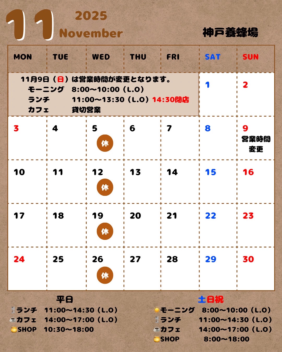11月9日(日)はカフェタイム貸切営業のため、下記の通り営業時間を変更いたします。