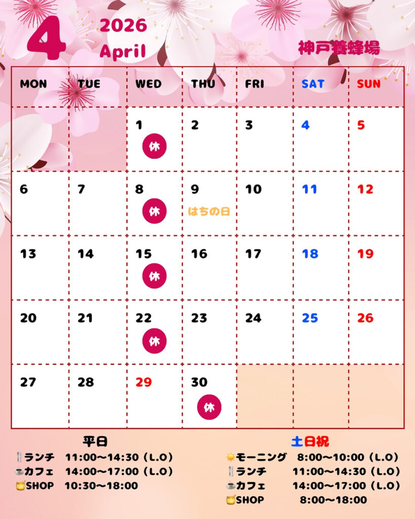 新着情報NEWS 2026.03.23お知らせ4月の営業日のお知らせ いつも神戸養蜂場をご利用いただき、誠にありがとうございます。4月の営業日および営業時間についてお知らせいたします。4月も皆さまのご来店を心よりお待ちしております。 前へ 一覧を見る TOPへ戻る